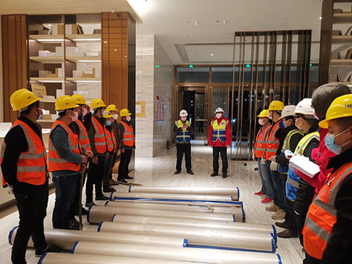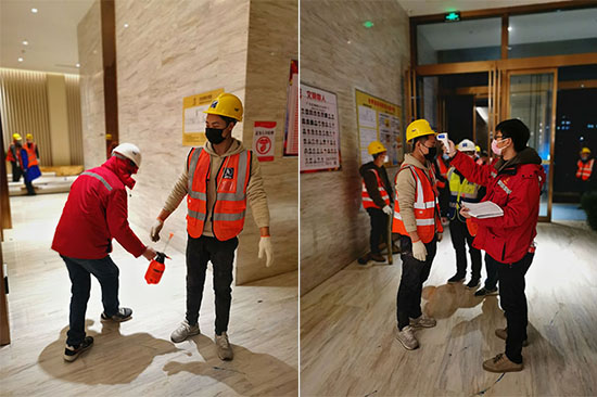 市政集團(tuán)領(lǐng)導(dǎo)在接到上級(jí)通知后,統(tǒng)籌安排,組織人力物力投入到三個(gè)酒店改造工程施工中。時(shí)間緊任務(wù)重,改建工作分為三個(gè)項(xiàng)目小組同步施工,其中全季酒店3、4、5樓三層樓共150個(gè)房間,市政集團(tuán)主要負(fù)責(zé)酒店走廊鋪裝改造,面積2000平米;城市快捷酒店3-13層樓共計(jì)11層樓202個(gè)房間,市政集團(tuán)主要負(fù)責(zé)走廊鋪裝改造,面積660平米;維也納酒店共計(jì)三層樓115個(gè)房間,面積3000平米;2月10日凌晨施工材料按照預(yù)定時(shí)間運(yùn)送到項(xiàng)目一線(xiàn),各項(xiàng)目小組立即成立項(xiàng)目專(zhuān)班,管理人員分工協(xié)作,各司其責(zé),對(duì)施工人員進(jìn)行班前安全交底及施工技術(shù)交底,面對(duì)嚴(yán)峻的疫情,各項(xiàng)目小組嚴(yán)格貫徹落實(shí)集團(tuán)公司領(lǐng)導(dǎo)傳達(dá)的“重防護(hù),保安全”思想,安排專(zhuān)職管理人員對(duì)每位施工作業(yè)人員進(jìn)行信息登記、體溫監(jiān)測(cè)記錄,施工作業(yè)人員在體溫正常,無(wú)其他異常情況并完成消毒、正確佩戴口罩等安全防護(hù)工作后方可進(jìn)入施工現(xiàn)場(chǎng)。