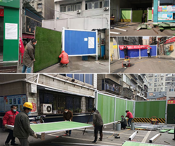 2月1日,在市政實力工程處二期供暖施工現(xiàn)場,經(jīng)理周毅峰為大家準備好了口罩、消毒水等防控物資,并同大家一起安裝PVC圍檔36米,輔綠植72平方,安裝反光標36米。2月4日---2月7日,在樊城立業(yè)路八個“重疫情街道”,大家冒著有可能被感染的危險,在做好自身防護的前提下,安裝了大門8扇、PVC圍檔24米。2月14日,在寒潮來臨之際,上級領導要求把川惠大酒店鋪設成臨時收置疑似病人場所,一天的時間要安裝大門4扇,PVC圍檔114米,綠植228平方,反光標114米,時間短,任務重,天空還下著雪花,但交安公司的全體員工發(fā)揚吃苦耐勞的精神,克服困難,保質保量的完成了上級交給的任務。回家時,已是凌晨二點。2月15日,在滕天閣施工現(xiàn)場,因雨雪熔化,造成圍檔基礎下沉,存在安全隱患。雖然張建毅和袁超只睡了幾個小時,依然義無返顧去施工現(xiàn)場,整理修復硬質圍檔15米。2月19日,城市交通都被禁止通行的情況下,經(jīng)理周毅峰請派出所的執(zhí)法車輛裝材料,去立業(yè)路金茂小區(qū)及米公所安裝大門2扇,PVC圍檔42米、反光標42米。
