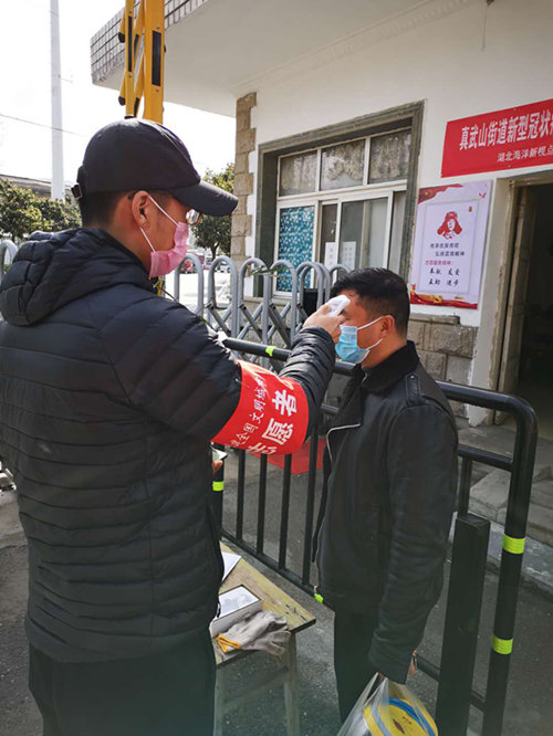 對出入小區(qū)人員檢查通行證,測量體溫,并進(jìn)行登記