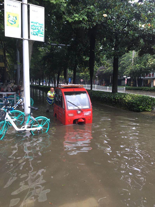 在觀察現(xiàn)場水患情況和市民扎堆擁堵現(xiàn)狀之后,市政集團(tuán)二公司經(jīng)理馮陽陽在現(xiàn)場快速定出三條措施應(yīng)對。第一,在積水路口的四個方向安排專人指揮過往車輛提前掉頭繞行,避免司機(jī)涉水車輛被淹;第二,在人行道上安排專人將被水沖倒的共享單車收集歸整,清理出一條可供行人和非機(jī)動車臨時(shí)通行的便道,并引導(dǎo)其從淺水位置安全有序通行,既避免行人和非機(jī)動車交叉涉水的危險(xiǎn),又加快了通行效率;第三,在積水較深的十字路口集中力量幫扶需涉水過馬路的市民,特別是有小孩的時(shí)候,大家都主動抱起小孩涉水通行。