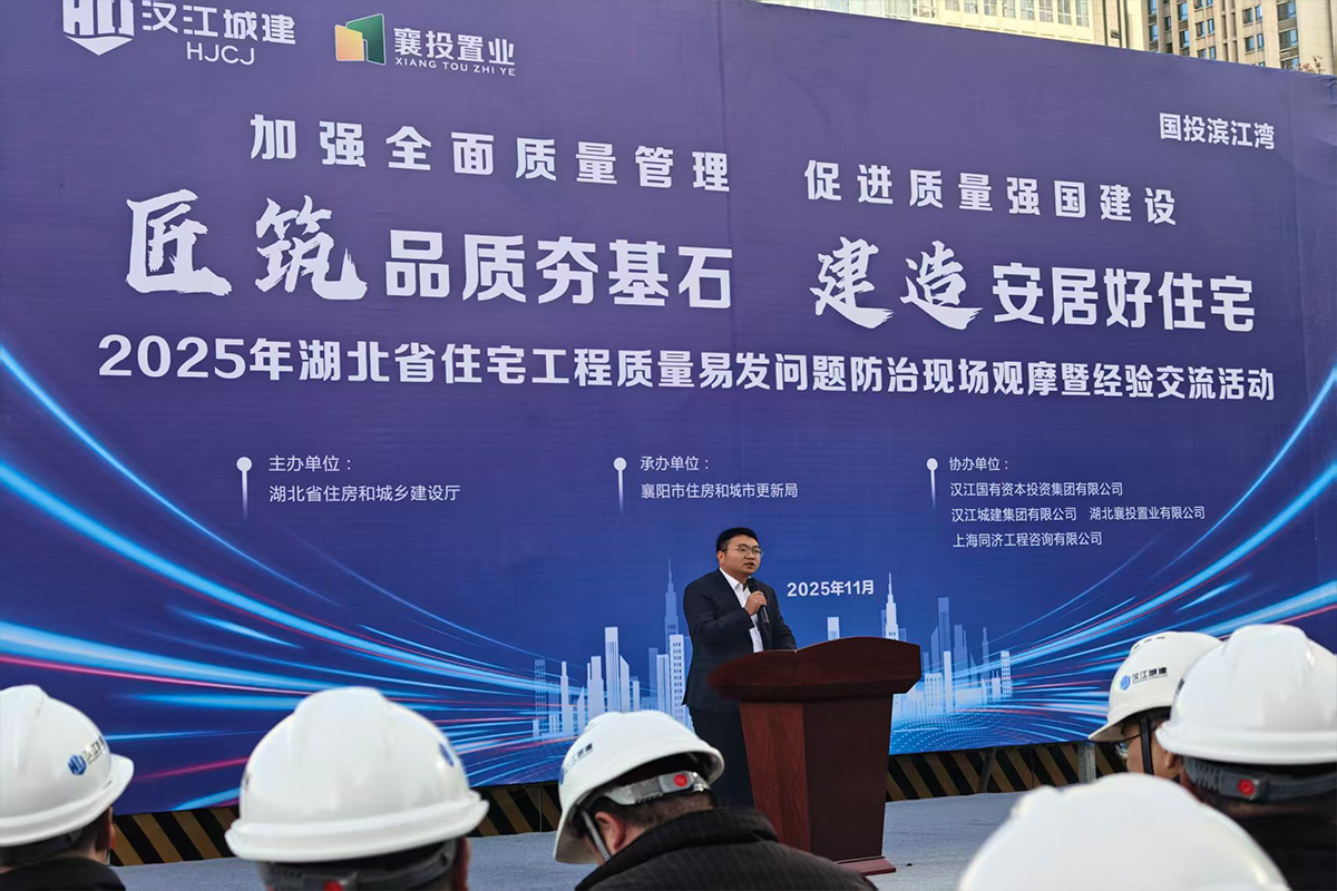 為深入落實“好房子”建設(shè)要求,推廣住宅工程質(zhì)量通病防治先進(jìn)經(jīng)驗,11月27日上午,由湖北省住房和城鄉(xiāng)建設(shè)廳主辦、襄陽市住房和城市更新局承辦,漢江城建集團(tuán)有限公司等協(xié)辦的“2025年湖北省住宅工程質(zhì)量易發(fā)問題防治現(xiàn)場觀摩暨經(jīng)驗交流活動”在國投濱江灣一期項目成功舉辦。來自襄陽各縣(市、區(qū))住建部門、質(zhì)量監(jiān)督機(jī)構(gòu)相關(guān)負(fù)責(zé)人,市區(qū)在建工程建設(shè)、施工、監(jiān)理單位項目負(fù)責(zé)人及質(zhì)量管理人員共計400余人齊聚現(xiàn)場,共學(xué)先進(jìn)工藝,共探品質(zhì)提升之道。