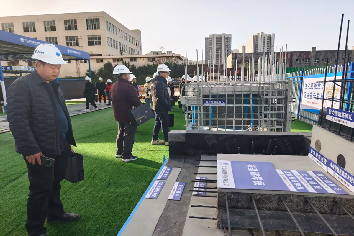 現(xiàn)場觀摩環(huán)節(jié),參會人員在工作人員的引導(dǎo)下,深入項目工藝樣板區(qū)、施工工作面等核心區(qū)域,沉浸式感受項目在質(zhì)量管控上的匠心細(xì)節(jié)。作為漢江城建集團(tuán)傾力打造的高品質(zhì)住宅標(biāo)桿,國投濱江灣項目以“根治質(zhì)量通病、提升居住品質(zhì)”為核心,構(gòu)建了全流程質(zhì)量管理體系。項目推行“樣板引路”制度,鋼筋綁扎、抹灰等關(guān)鍵工序均先做實體樣板,經(jīng)各方驗收合格后方可大面積施工;借助BIM技術(shù)進(jìn)行三維建模,提前規(guī)避基坑支撐梁與地下室結(jié)構(gòu)沖突等潛在問題,從源頭降低外墻滲漏等隱患風(fēng)險。