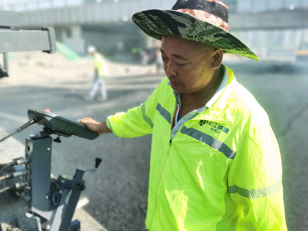 高溫天氣下,瀝青攤鋪施工現(xiàn)場(chǎng)更是酷熱難耐。8月12日,在丹江路(長(zhǎng)征路—魚梁洲大橋)改造工程施工現(xiàn)場(chǎng),攤鋪機(jī)緩緩前行,壓路機(jī)隨后跟上往返碾壓路面,此時(shí)瀝青表面溫度已經(jīng)達(dá)到140℃以上,漢江城建第三分公司一線工作者們正經(jīng)受著烈日和高溫瀝青的雙重“烤驗(yàn)”。