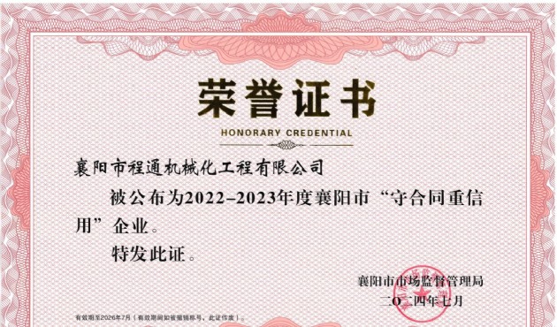 喜訊!程通機械化公司憑借其在市場經營中的卓越表現(xiàn)和對合同精神的嚴格遵守,榮獲了由襄陽市市場監(jiān)督管理局頒發(fā)的襄陽市2022&mda