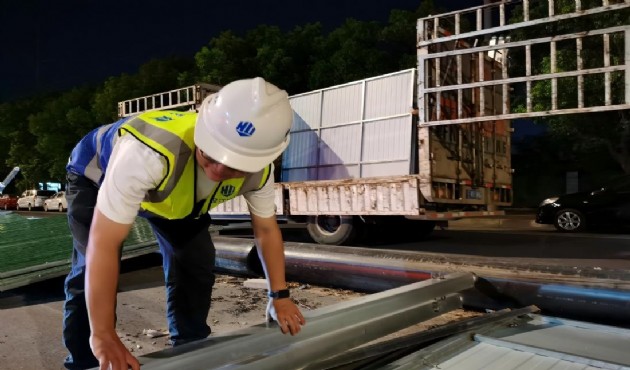 2024年8月2日夜,在名城路上,一處繁忙的施工工地燈火通明,交安公司員工正加班加點拆除圍擋,為城市交通便利默默付出。拆除圍擋