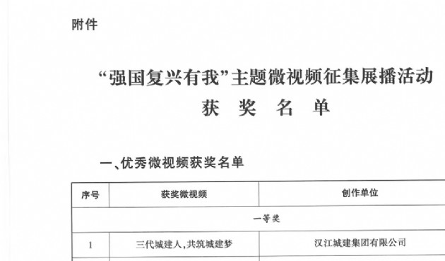 喜報(bào)!漢江城建榮獲“強(qiáng)國復(fù)興有我”主題微視頻征集展播活動一等獎