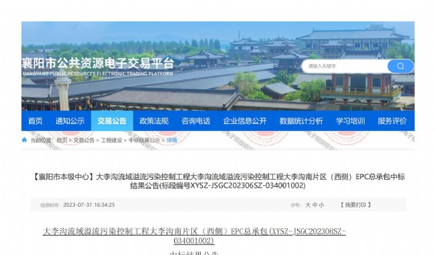 2023年7月31日,漢江城建集團有限公司牽頭中標大李溝流域溢流污染控制工程大李溝南片區(qū)(西側(cè))EPC總承包項目(以下稱“本項