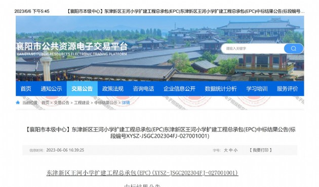6月6日,漢江城建集團(tuán)有限公司牽頭中標(biāo)東津新區(qū)王河小學(xué)擴(kuò)建工程總承包(EPC)項(xiàng)目,中標(biāo)金額3590.57萬元,建設(shè)工期300天。該項(xiàng)目位
