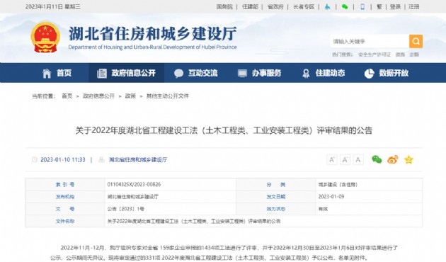 近日,湖北省住房和城鄉(xiāng)建設廳發(fā)布了《關于2022年度湖北省工程建設工法(土木工程類、工業(yè)安裝工程類)評審結果的公告》,對審定