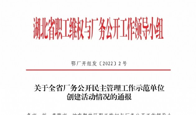 近日,湖北省職工維權與廠務公開工作領導小組發(fā)布《關于全省廠務公開民主管理工作示范單位創(chuàng)建活動情況的通報》,漢江城建獲評全