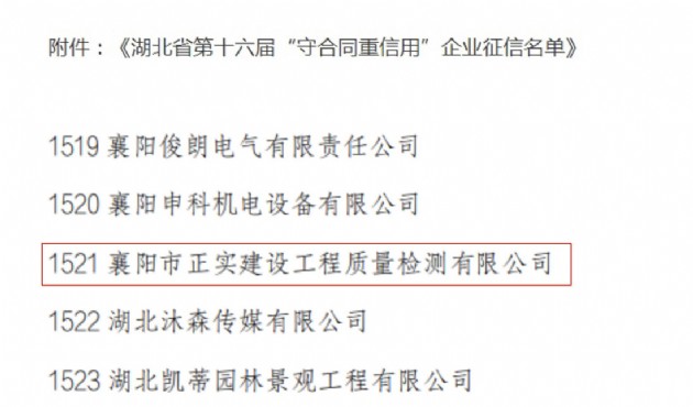 近日,襄陽(yáng)市正實(shí)建設(shè)工程質(zhì)量檢測(cè)公司順利通過湖北省市場(chǎng)監(jiān)督管理局評(píng)審,榮獲“湖北省守合同重信用企業(yè)”稱號(hào)。&ldq