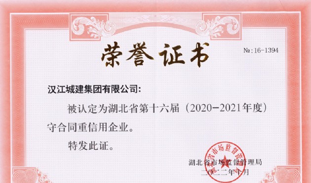 近日,漢江城建榮獲由湖北省市場監(jiān)督管理局頒發(fā)的第十六屆(2020-2021年度)“守合同重信用”企業(yè)稱號。此項榮譽的獲得