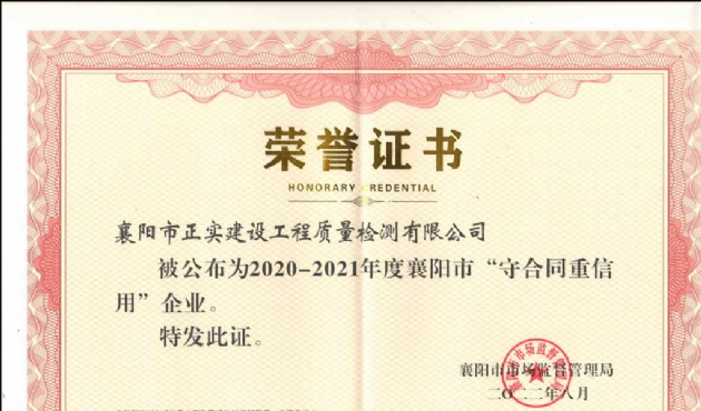 近期,襄陽市市場監(jiān)督管理局正式發(fā)布了2020-2021年度襄陽市“守合同重信用企業(yè)”名單,正實檢測公司憑借著以誠取信、以