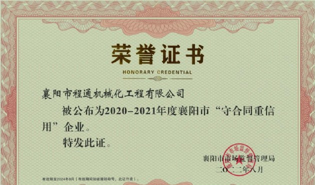近日,襄陽市市場監(jiān)督管理局正式公布了2020—2021年襄陽市守合同重信用企業(yè)名單,程通機(jī)械化工程有限公司秉承依法經(jīng)營、誠信