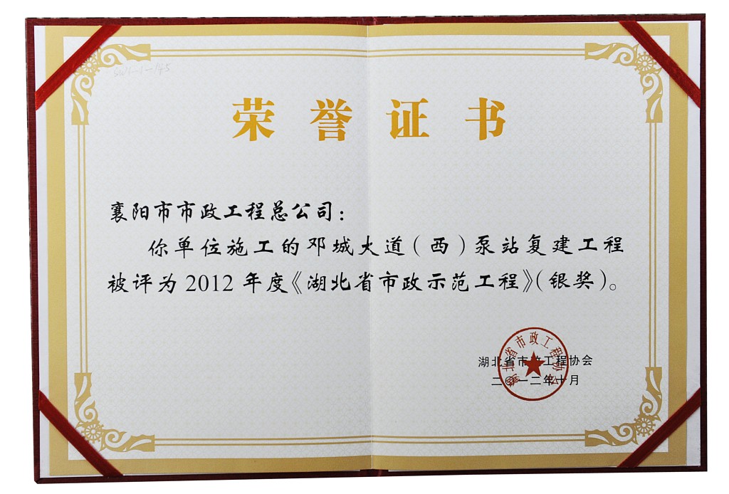 2012鄧城大道工程湖北省市政示范工程銀獎(jiǎng)