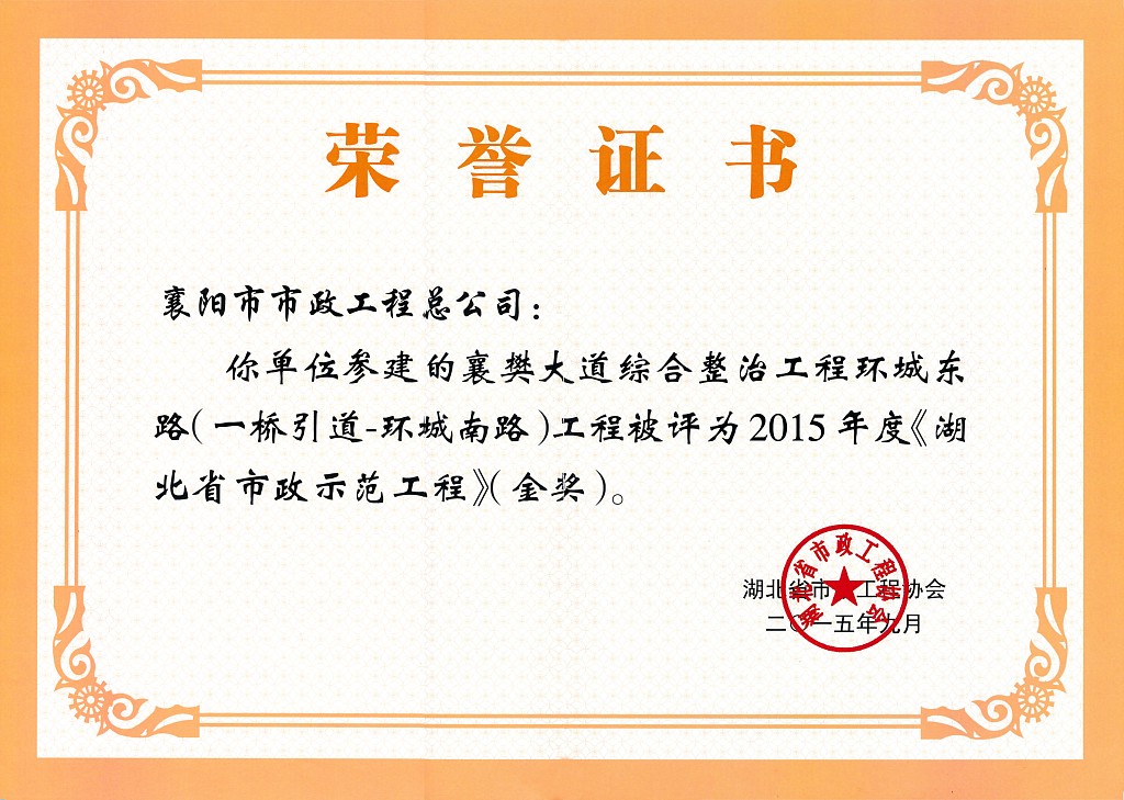 2015襄樊大道環(huán)城東路綜合整理湖北省示范工程金獎(jiǎng)