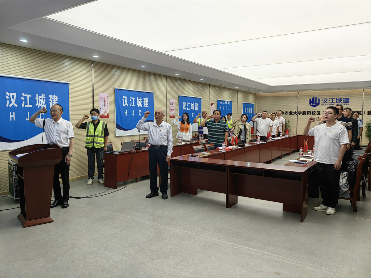 為進(jìn)一步學(xué)習(xí)和發(fā)揚(yáng)“鐵軍精神”,不斷加強(qiáng)基層黨組織的凝聚力和戰(zhàn)斗力,打造精品工程和廉潔工程,5月26日下午,漢江城建建安分公司黨支部聯(lián)合東津新區(qū)城鄉(xiāng)建設(shè)局、智投公司、中韜華勝監(jiān)理公司、漢江城建第二分公司四個(gè)支部在華中農(nóng)業(yè)大學(xué)襄陽(yáng)校區(qū)(現(xiàn)代農(nóng)業(yè)研究院)建設(shè)項(xiàng)目部共同舉辦“黨建進(jìn)工地 強(qiáng)化責(zé)任擔(dān)當(dāng)”主題黨日活動(dòng),共50余人參會(huì)。