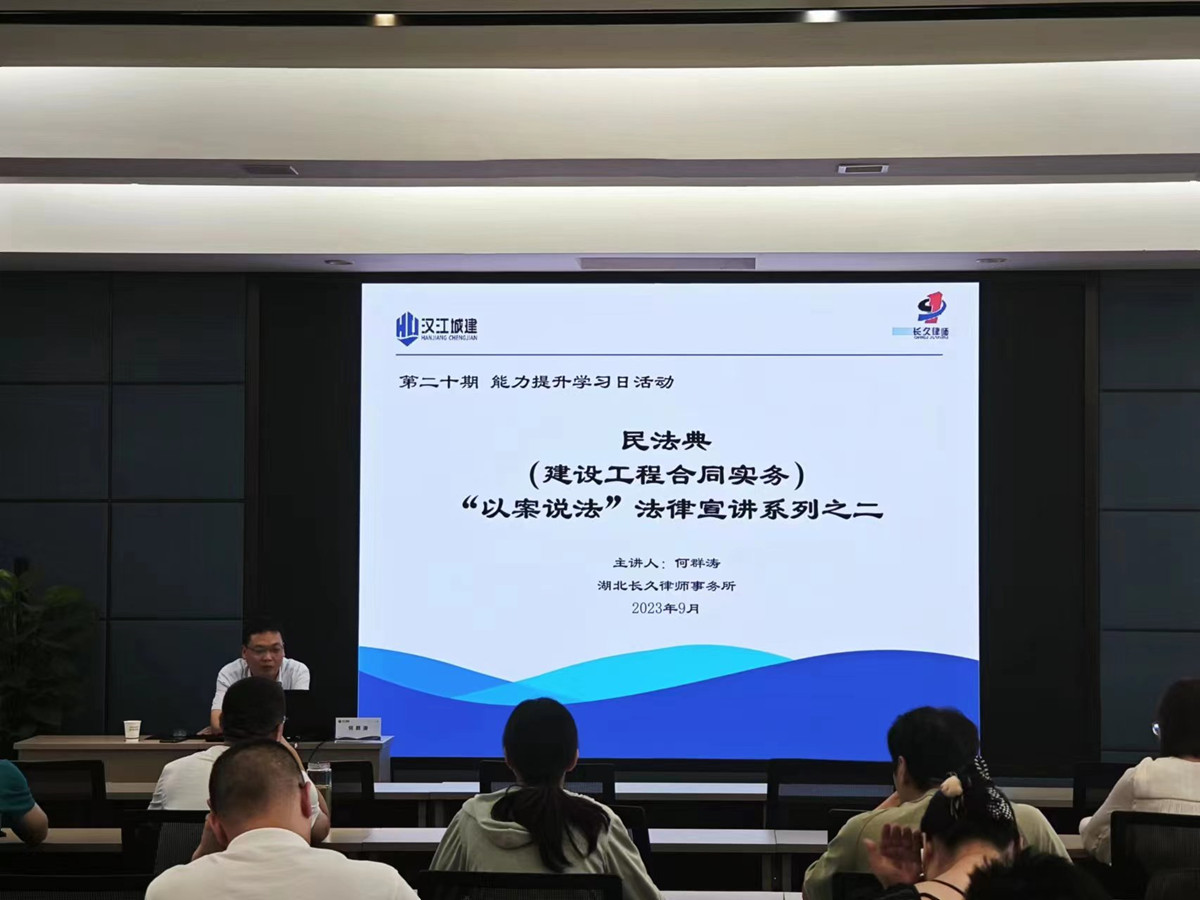 為進(jìn)一步提升員工法律風(fēng)險(xiǎn)防范意識(shí),加強(qiáng)公司經(jīng)營(yíng)合規(guī)管理水平,9月15日下午,漢江城建集團(tuán)有限公司在集團(tuán)603會(huì)議室開展“以案說(shuō)法”建設(shè)工程合同實(shí)務(wù)為主題的第二十期能力提升學(xué)習(xí)日法律宣講活動(dòng),機(jī)關(guān)各部室、各分(子)公司共30余人參加培訓(xùn)。
