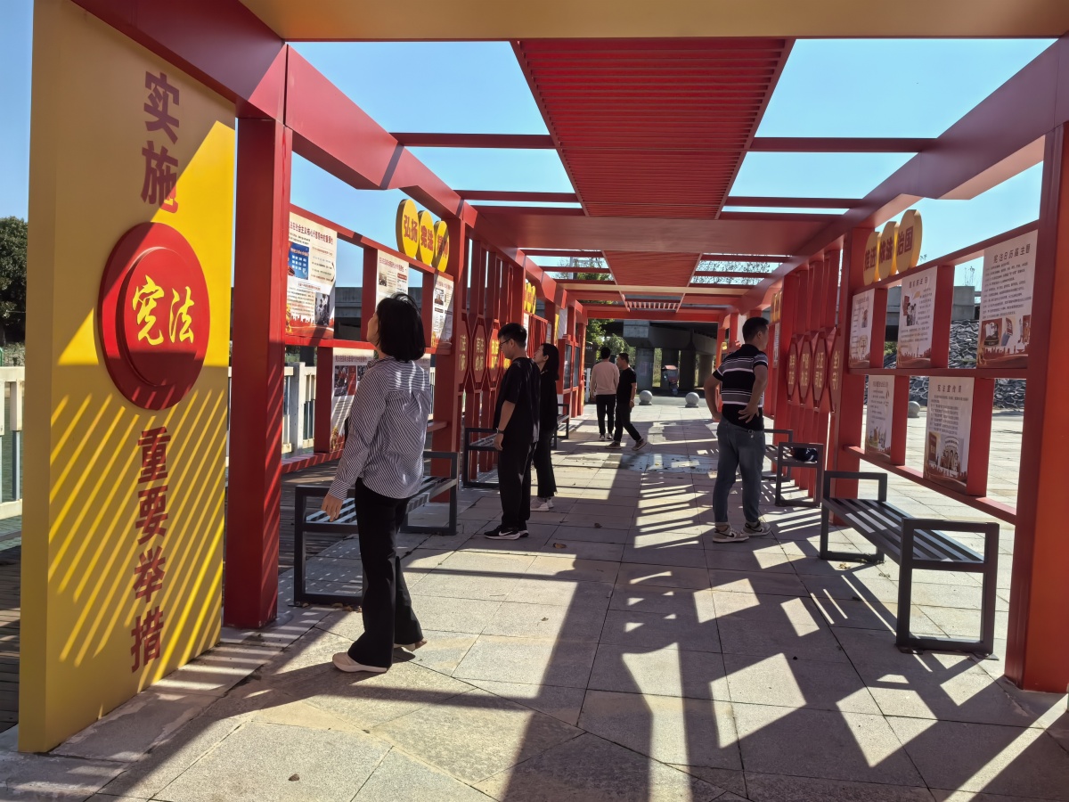 走進法治文化長廊,兩側的宣傳展板集中展示了近年來實施憲法的重要舉措。大家通過觀看宣傳展板,全面了解了國家憲法和民法典的由來及設立的意義。